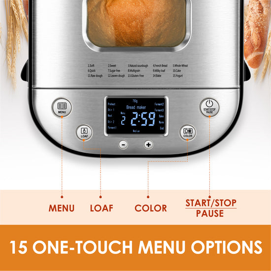 | [15-in-1 AUTOMATIC BREAD MACHINE with 2 LB Large Capacity ] 15 customized automatic programs include 10 Bread Menus (Soft, Sweet, natural sourdough, French bread, whole-wheat, gluten-free, etc), 5 Non Bread Menus (Cake, Yogurt, Dough...). It has 3 loaf capacity of 1/1.5 /2.0 lb, 3 crust color options in light/medium/dark. [Easy to Operate & Friendly For NEWBIES & PROS] Simply add ingredients(according to the recipes we provided) and press the START button once. The bread maker machine automatically mixes, kneads ingredients by kneading paddle, rises and bakes. You also can create your own menu using the dough and baking menu. [Humanized Design for Healthier & Fresher Bread] 15-Hour Delay Timer perfect for breakfast without getting up early, 1-Hour Automatic Keeping Warm and 15-minute Power Failure Backup allows to enjoy the healthier homemade bread anytime. And the digital bread maker is equipped with a large intuitive touch panel, which makes the operation easier and more precise. [More Than a Bread Maker & Unique Design] Full stainless steel bread maker for long-lasting durability, rust-proof, elegant silver exterior, and tempered glass cover make the bread maker more like a work of art. [Devoted Services] 1 YEAR Warranty & 12 Hours Quick Customer Service Response, Enjoy The Shopping Experience On Us! |